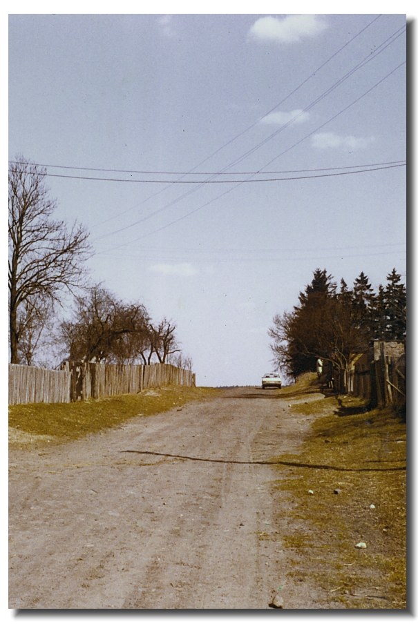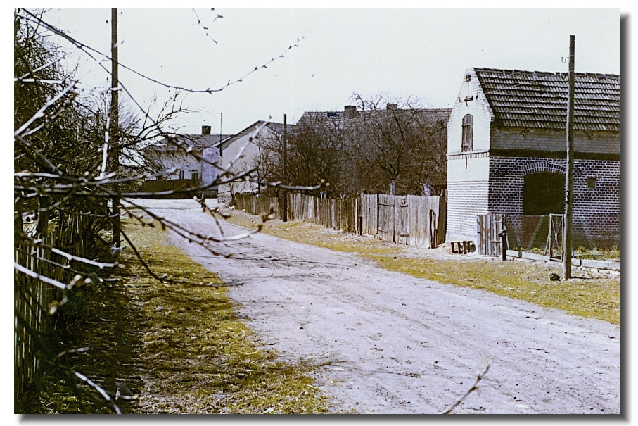 | Dieses Bild blickt zurück zum Dorf Preußenfeld. Dieses erstreckt sich von der Kreuzung nach rechts. Nach links führt 1945 ein Weg durch die Felder, zu der etwa 1km entfernten Grenze zwischen der Republik Polen und dem Deutschen Reich und ein zweiter Weg zu dem 5km entfernten Nachbarort Seefelde, der am Steinmarker See liegt. Wie der gezeigte Weg im Vordergrund heißt ist unbekannt .. |