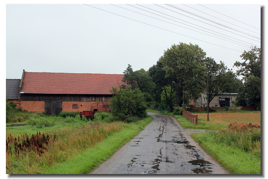 | 2011: Ortseingang von Preußenfeld aus Richtung Smirtenau kommend. Links eine Scheune des ehemaligen Gutshof Weise, auf dem E.S. tätig war. Rechts hinter dem grauen Haus das ehemalige Gutshaus. |
