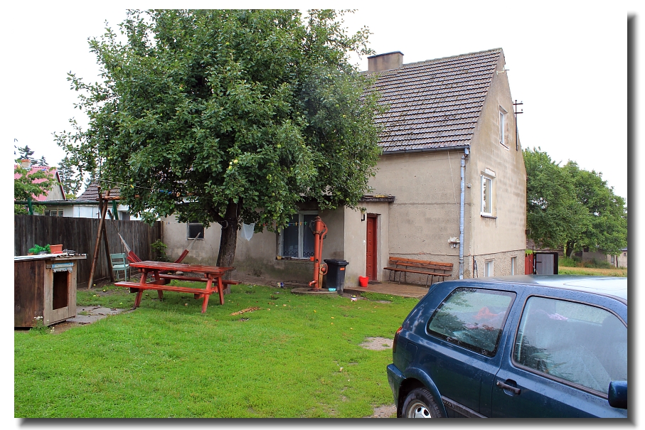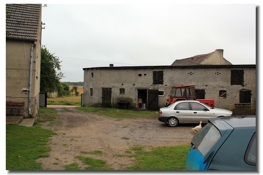 | Der Hofbereich des Hofes von T.S. Die Wirtschaftsgebäude haben sich seit 1945 nicht wesentlich verändert. Oben die Scheune, unten die Ställe für die Tiere. Im Hintergrund des unteren Bildes ist über die Felder hinweg der Waldrand zu erkennen, der im Jahr 1920 die Grenze zum 'polnischen Korridor' bildete. |