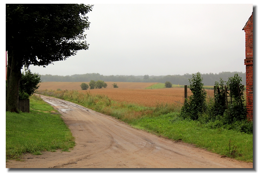 | Blick von der Kreuzung Friedhofsweg, Seefelder Straße in den Grenzweg. Rechts hinter den Feldern die Landstraße von Wissek nach Krojanke |
