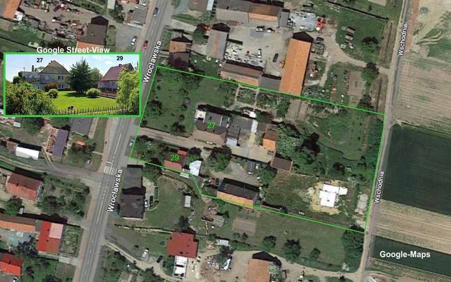 | Link: Google Street-View Rogow Sobocki, Wroclawska 27 und 29 Das obige Bild von Google-Maps zeigt die Häuser in denen vor 1945 die Familie Schwarzer wohnte. Der untere Link zeigt sie mit Hilfe von Google Street-View. Nach der Betätigung dieses Links, kann von hier aus weiter durch Rogow gewandert werden. www.google.com/maps/@50.9296505,16.759388,3a,53.8y,127.14h,90.48t/data=!3m6!1e1!3m4!1s3QfKrLJ1s-D6J-RgR22OiQ!2e0!7i16384!8i8192 |