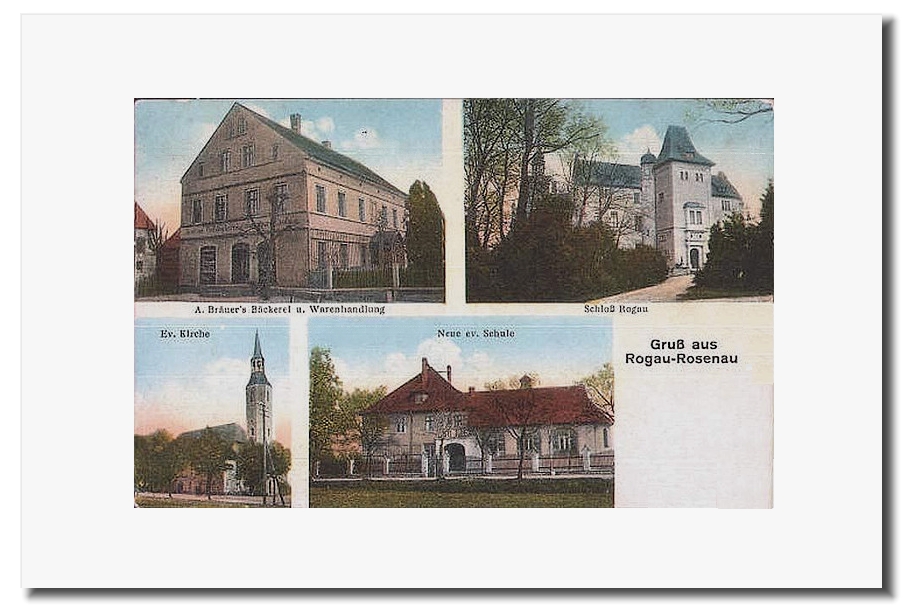 | Die colorierte Postkarte stammt aus der Zeit vor 1945. Sie zeigt A.Bräuers Bäckerei und Warenhandlung (oben,links), das Schloss des Fürsten Graf Pückler (oben rechts), die evangelische Kirche, die beide 1945 zerstört werden, sowie die neue evangelische Schule. Zu dieser Zeit besitzt Rogau Rosenau etwa 1300 Einwohner. |