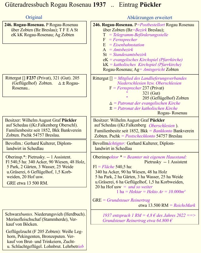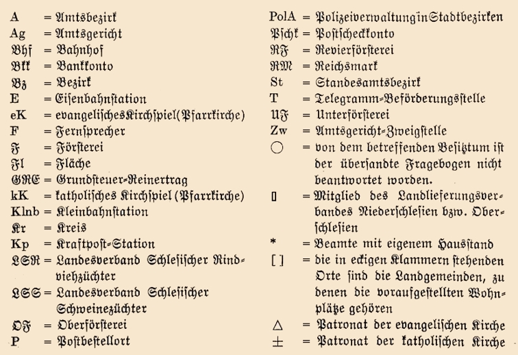 | Das obige Bild aus dem Schlesischen Güteradressbuch des Jahres 1937 nennt alle in diesem Buch als Gut bezeichneten Bauernhöfe des Ortes Rogau Rosenau. Das nachfolgende Bild erklärt die Bedeutung der im Text verwendeten Abkürzungen. Die Bezeichnungen Gut Nr. xx scheinen eine Art der Hausnummerierung zu sein, denn sie finden sich in allen Ausgaben von Güteradressbüchern wieder. |