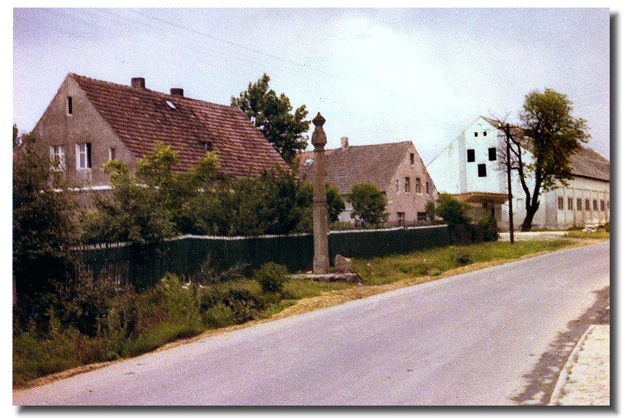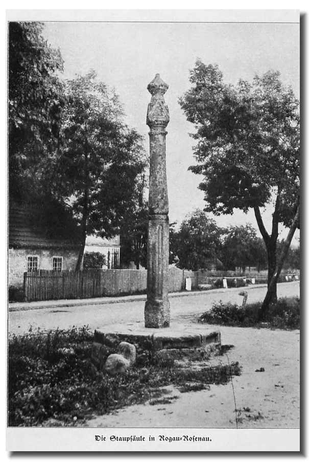 | Die Staupsäule von Rogau-Rosenau. An einem derartigen Pranger wurden im Mittelalter, bis hinein in das 19.Jahrhundert, Personen mit Verfehlungen 'gestaupt', also mit einer Rute geschlagen. Das obige Bild wurde vor dem 2.Weltkrieg aufgenommen, das untere Bild 1976. www.google.com/maps/@50.9261814,16.7583427,3a,48.4y,334.56h,94.3t/data=!3m6!1e1!3m4!1syVDtONnqx0GGuUcbddmYPQ!2e0!7i16384!8i8192 |
