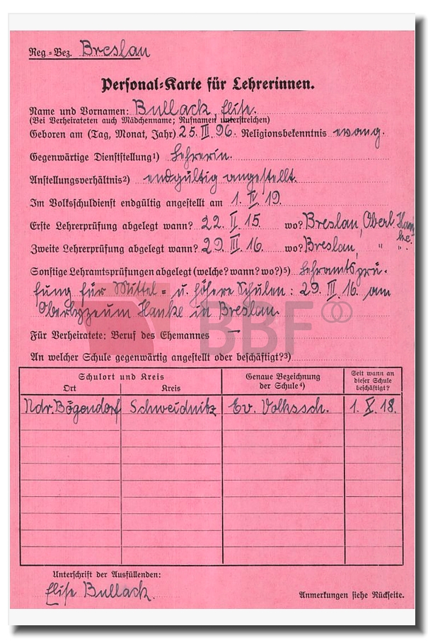 ~1918: Personalkarte der Lehrerin Elise Bullack, die seit dem 01.10.1918 in der ev.Schule von