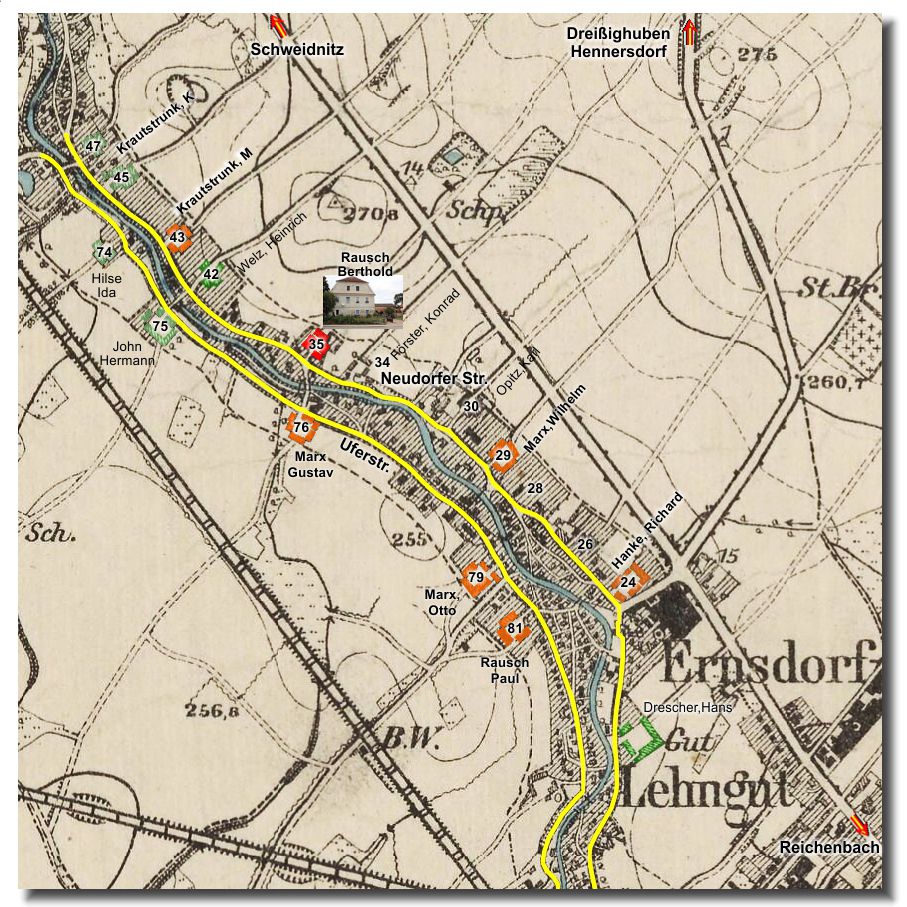 | Neudorfer Straße 35/36 | Rausch (ER) | Berthold | Rausch, Berthold + Martha (geb. Seidel) Pächter: Rausch, Berthold (jun) + Helene (geb.Marx) | 48,0 ha | 1475 RM |